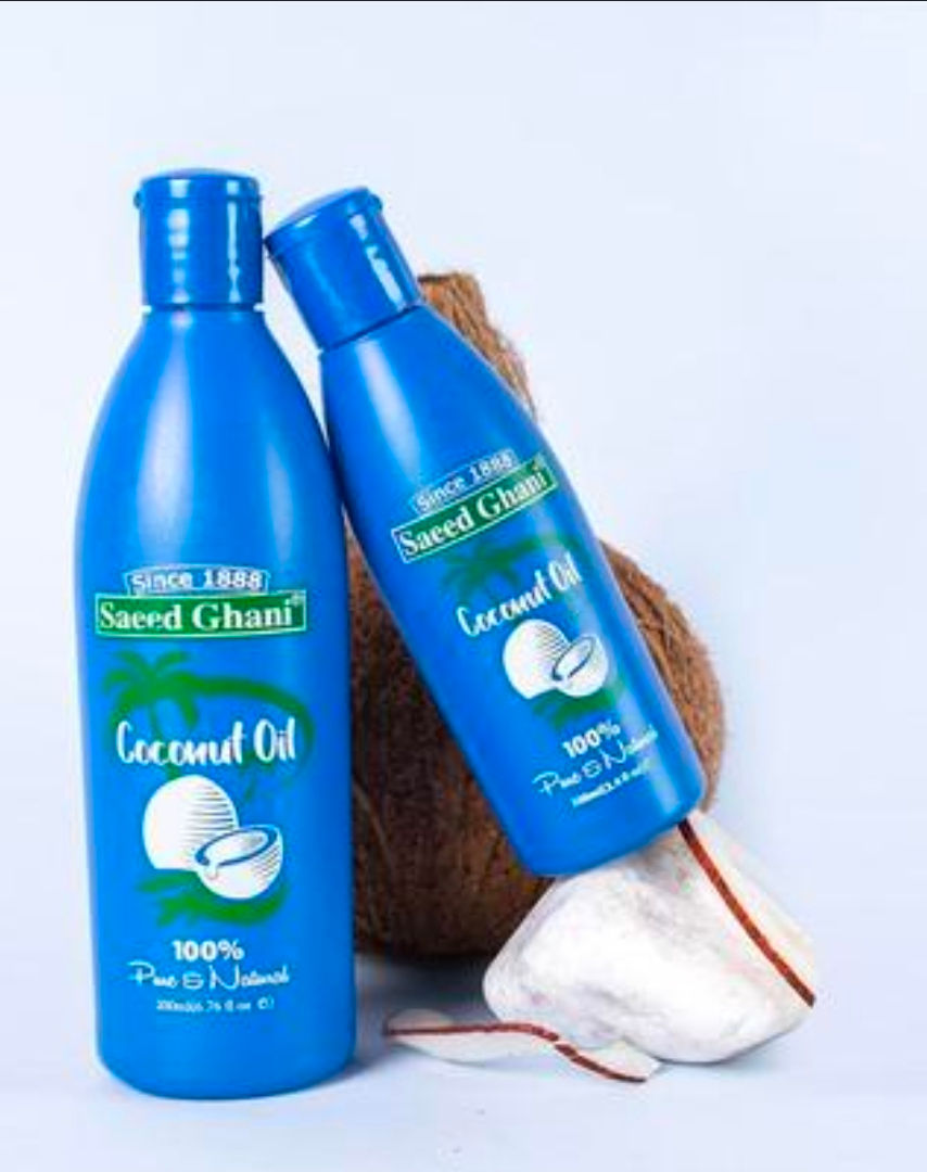 Blue bottle of Saeed Ghani coconut oil with coconuts and green leaves in the background